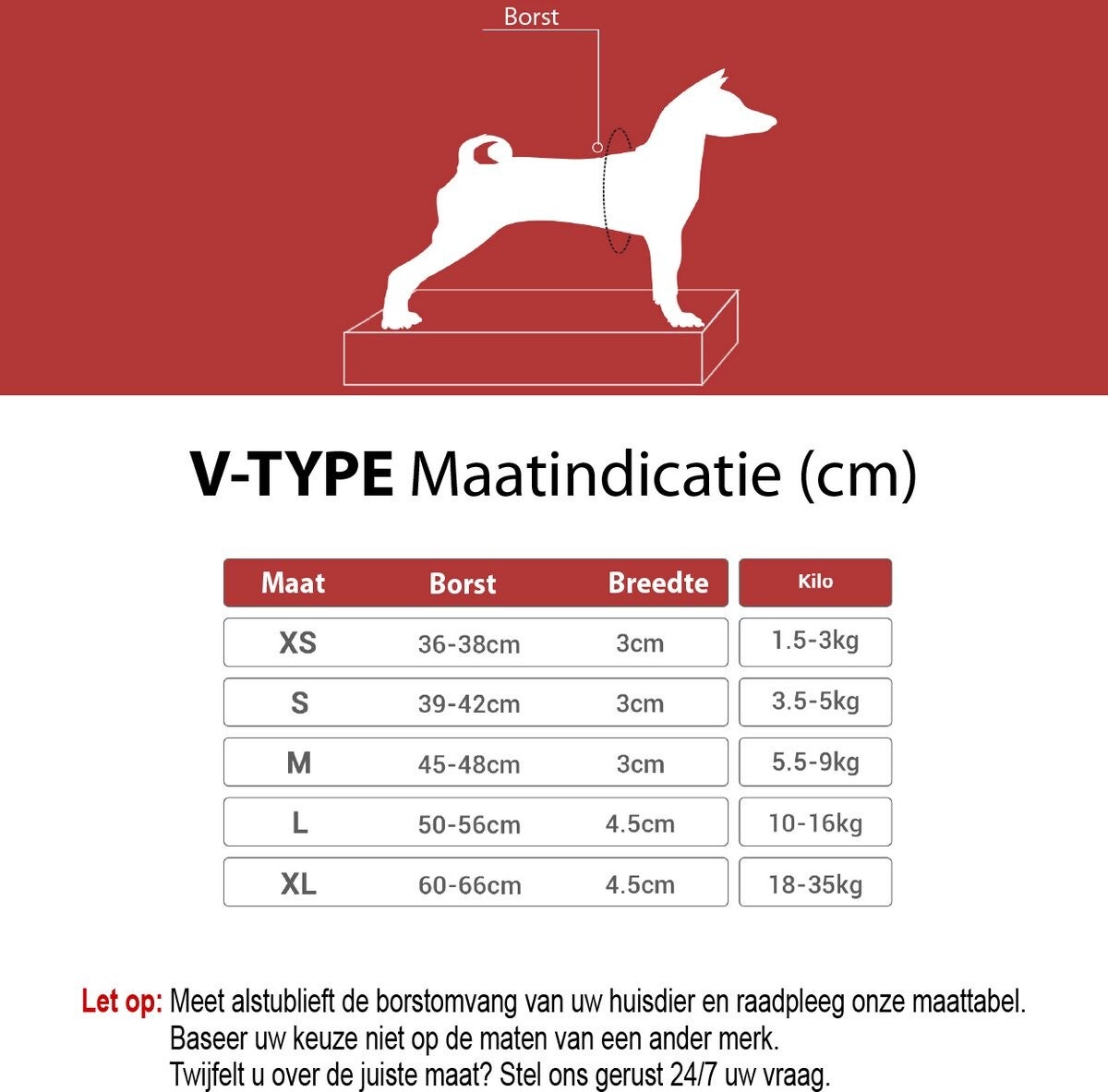 Wij verzoeken u vriendelijk de borstomvang van uw huisdier zorgvuldig op te meten en onze maattabel te raadplegen. Houd er rekening mee dat maten van andere merken niet als referentie gebruikt kunnen worden. Indien u twijfelt over de juiste maat, kunt u ons te allen tijde een vraag stellen.